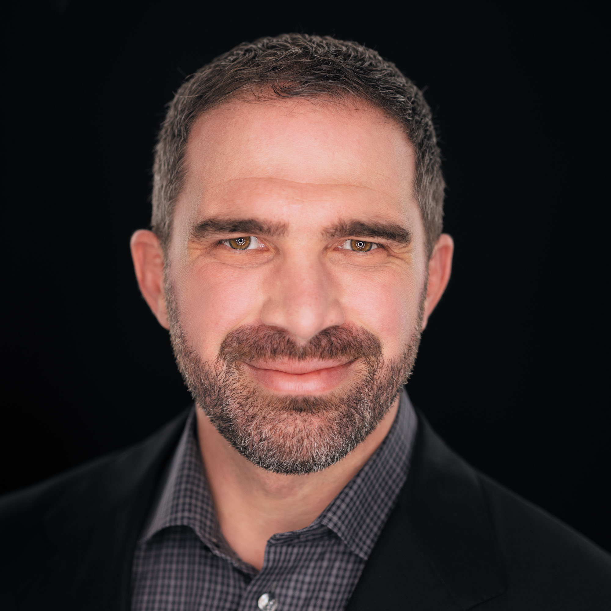 A professional headshot of a man with short, neatly trimmed salt-and-pepper hair and a full beard, smiling warmly at the camera. He has light skin and expressive hazel eyes that reflect the studio lighting. He is dressed in a dark blazer over a checkered button-down shirt, with the top button casually undone. The background is a solid black, providing contrast that draws focus to his face. The lighting is soft and even, highlighting the texture of his beard and the detail in his shirt. This image features Family Photographer Jason Guy prominently, presenting a friendly and approachable demeanor ideal for his professional role.