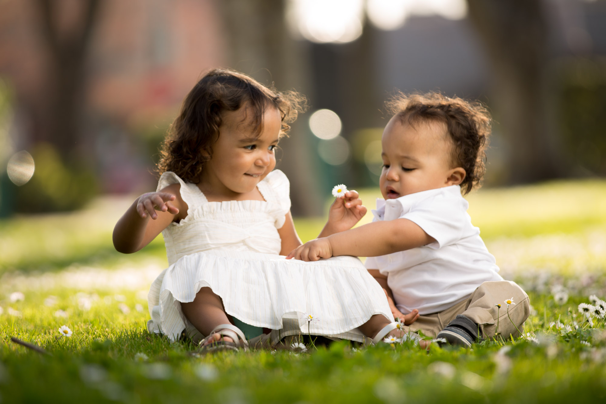 An older sister and her baby brother enjoy an authentic happy moment sitting on the grass surrounded by small daisies for their brother sister portrait. Soft sunlight highlights her white ruffled dress and his white shirt as they platy together. She holds a white daisy in her hand as her brother points to another laying on her dress.