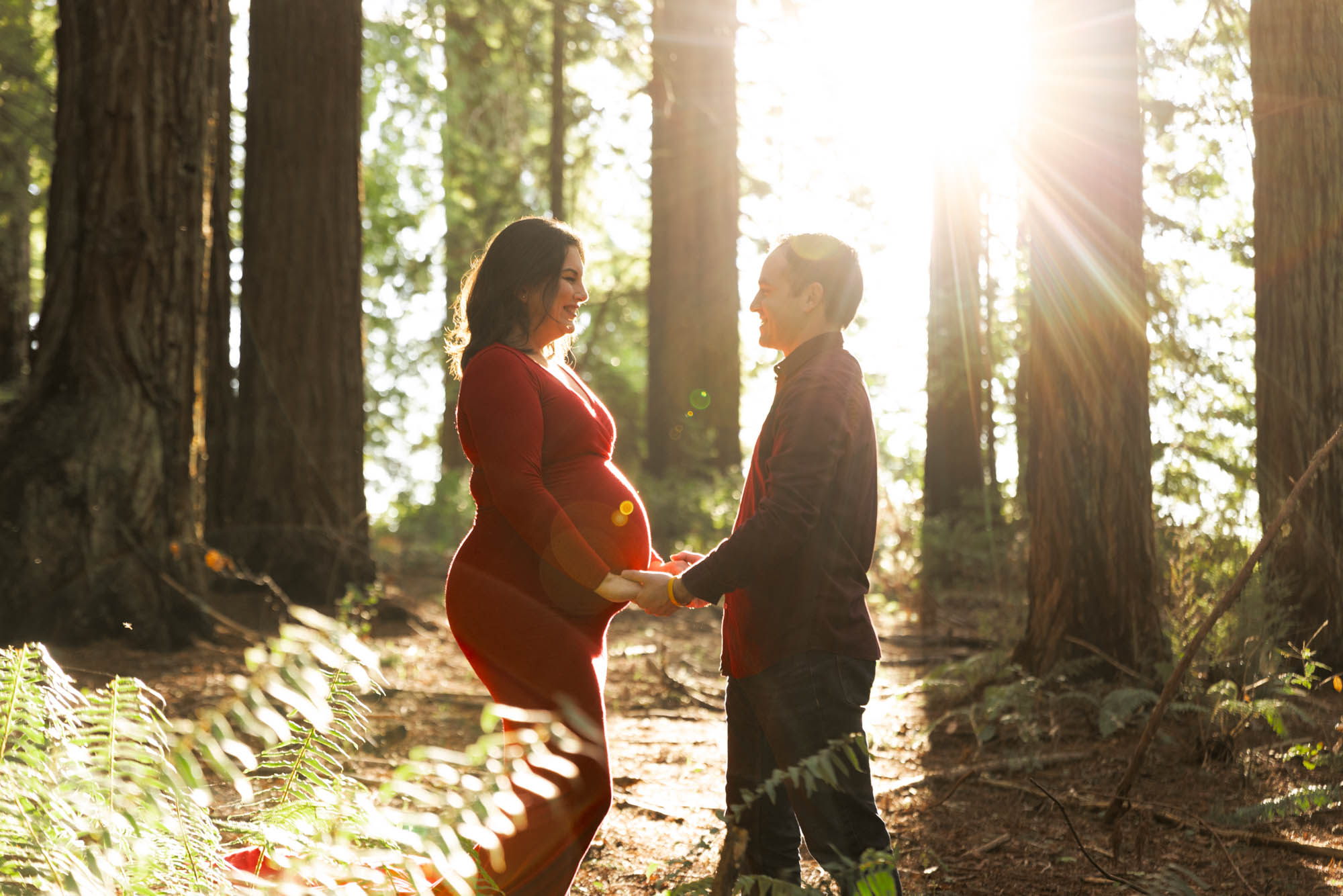 A pregnant woman in a long red dress and her husband smile at each other during their couples maternity photos in a redwood forest. They stand face to face holding hands over her belly as bright golden sunlight streams through the tall trees creating beautiful lens flare.