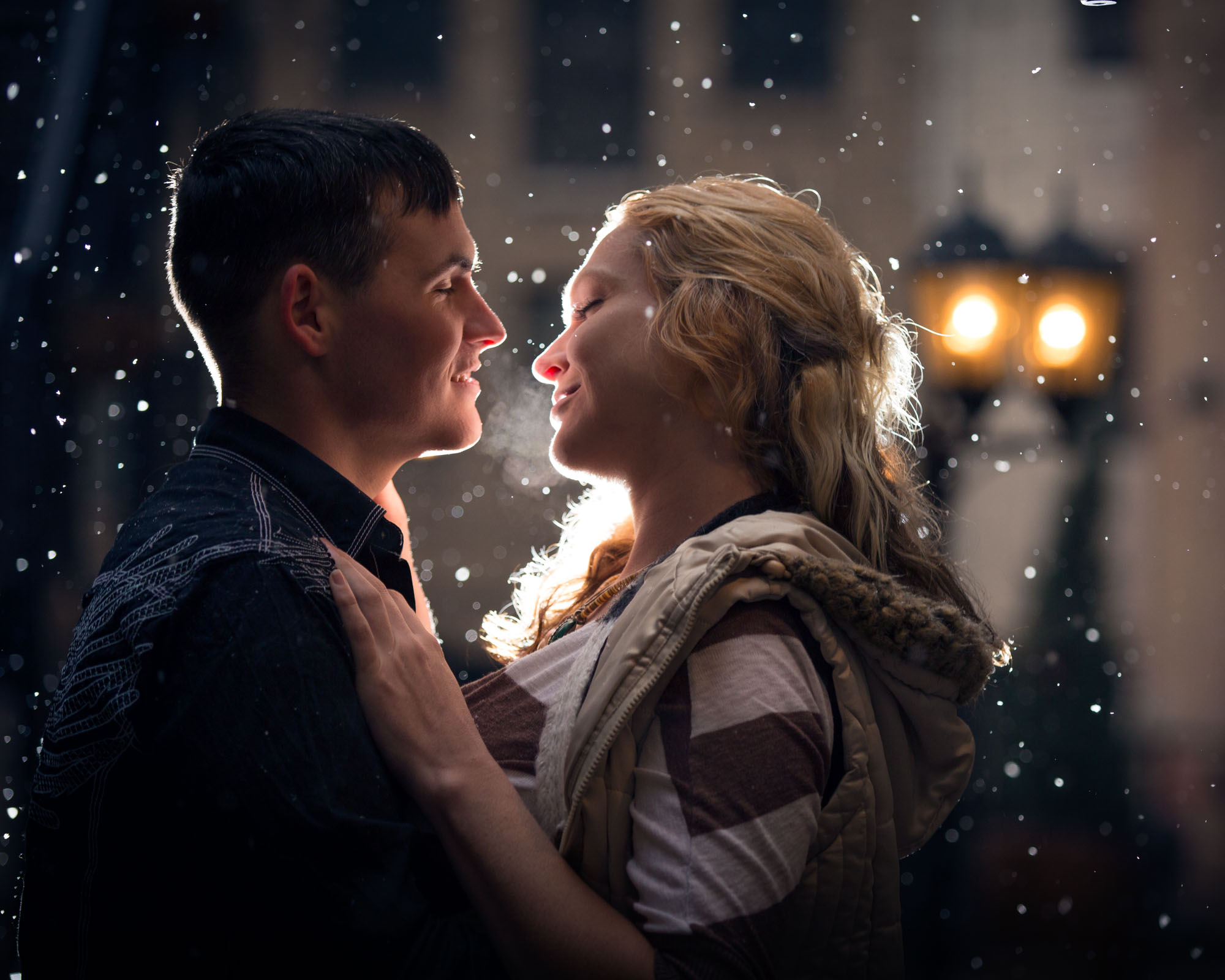 A young couple smiles lovingly at each other with snow gently falling around them during an engagement photo shoot. The woman rests her hand affectionately on the man's shoulder while warm golden light illuminates their faces from behind.
